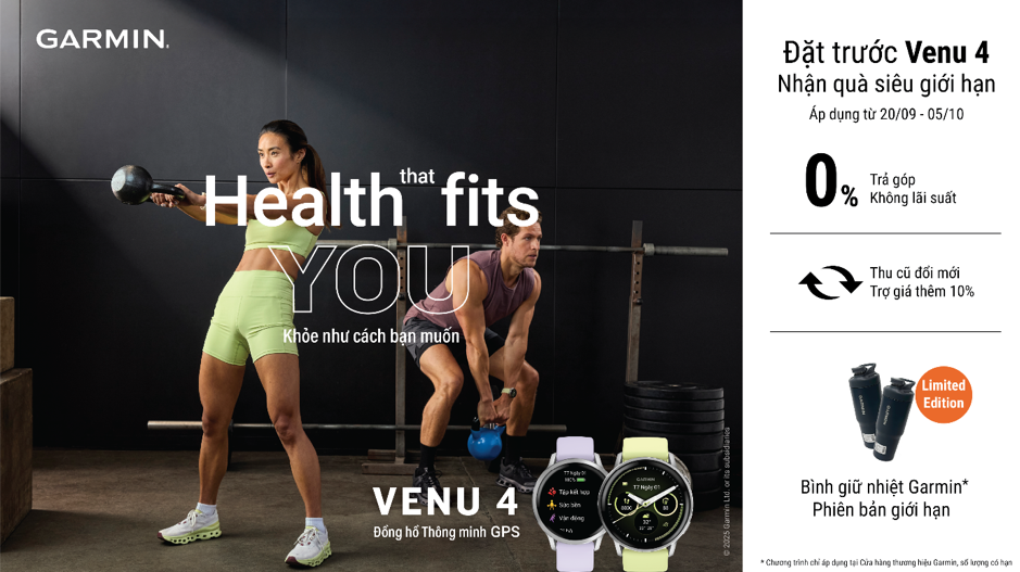 Khách hàng đặt trước Venu 4 từ 20/09 – 05/10/2025 sẽ nhận ngay bình giữ nhiệt Garmin phiên bản đặc biệt (số lượng có hạn, áp dụng tại cửa hàng Thương hiệu Garmin). Bên cạnh đó, sản phẩm vẫn được áp dụng các chương trình ưu đãi tiêu chuẩn: