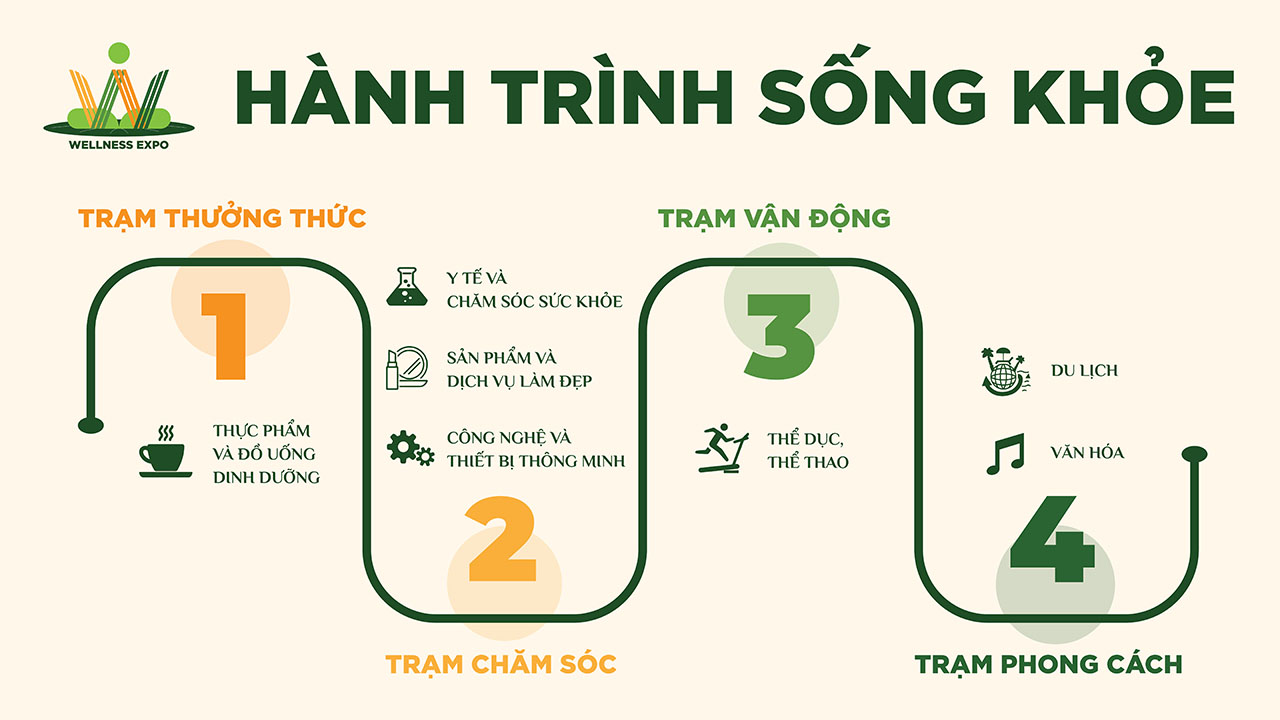 Sống khỏe không phải là đích đến, mà là một cuộc hành trình, cần sự kiên trì và sự kết hợp hài hòa các yếu tố, bao gồm: Đồ ăn và thức uống chúng ta nạp vào cơ thể mỗi ngày; Các sản phẩm chúng ta sử dụng để bảo vệ và chăm sóc sức khỏe; Vận động và thể dục thể thao; Những sở thích, thói quen lành mạnh và những cách thức tích cực mà chúng ta tận hưởng cuộc sống. Tới với Wellness Expo 2023, khách tham quan sẽ bước vào một hành trình sống khỏe với 04 Trạm trải nghiệm, bao gồm: Trạm Thưởng Thức, Trạm Chăm Sóc, Trạm Vận Động và Trạm Phong Cách. Qua đó, ban tổ chức hy vọng Wellness Expo 2023 sẽ đóng vai trò như một chiếc chìa khóa mở ra hành trình sống khỏe của khách hàng và truyền cảm hứng sống khỏe cho cộng đồng.