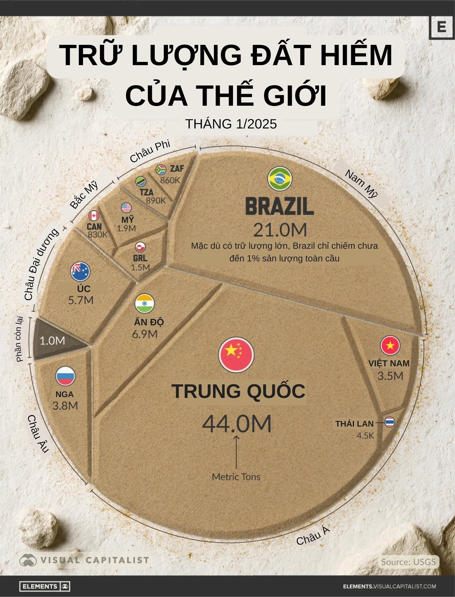 Bản đồ trữ lượng đất hiếm toàn cầu năm 2025, Trung Quốc vẫn dẫn đầu.